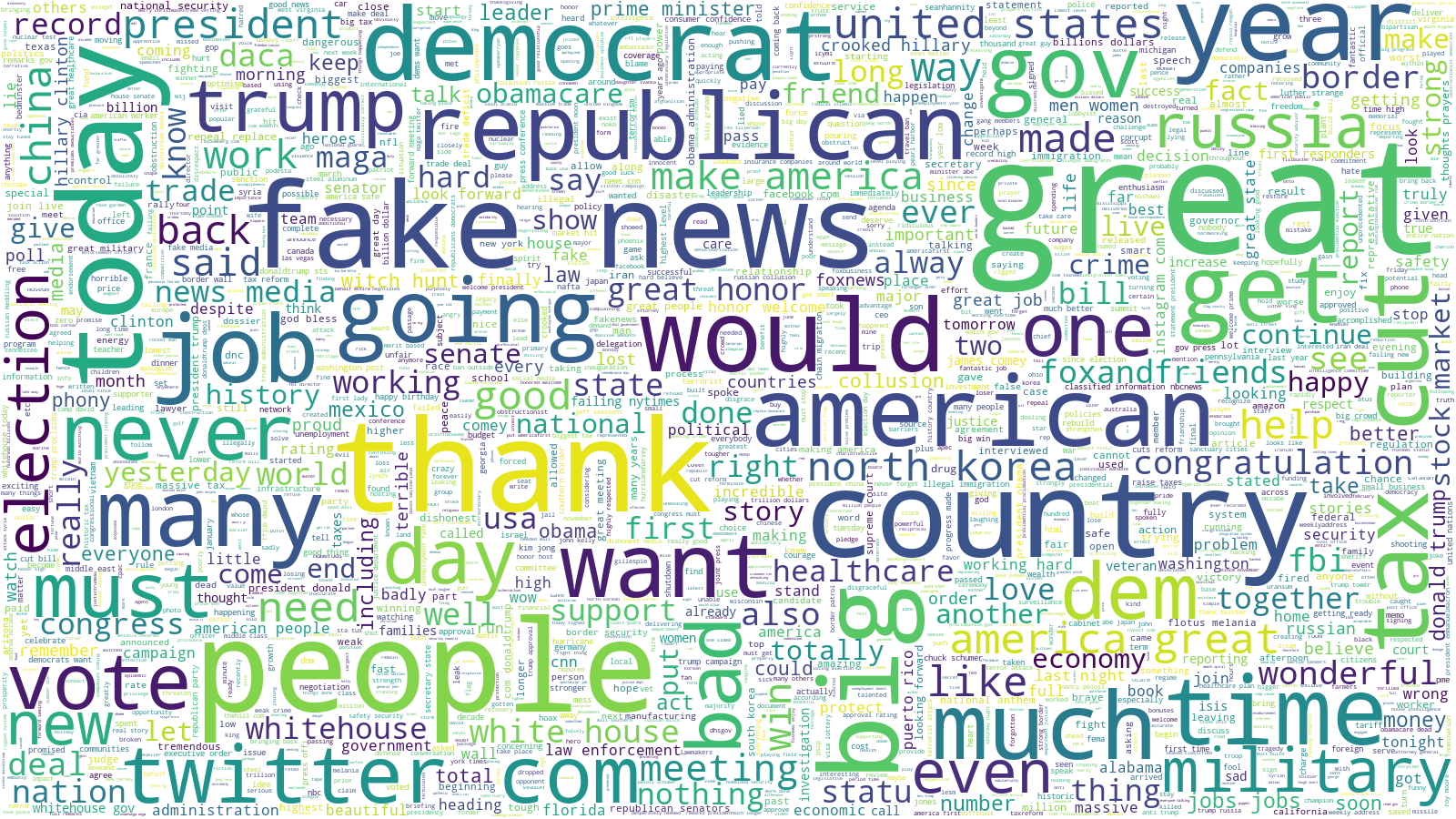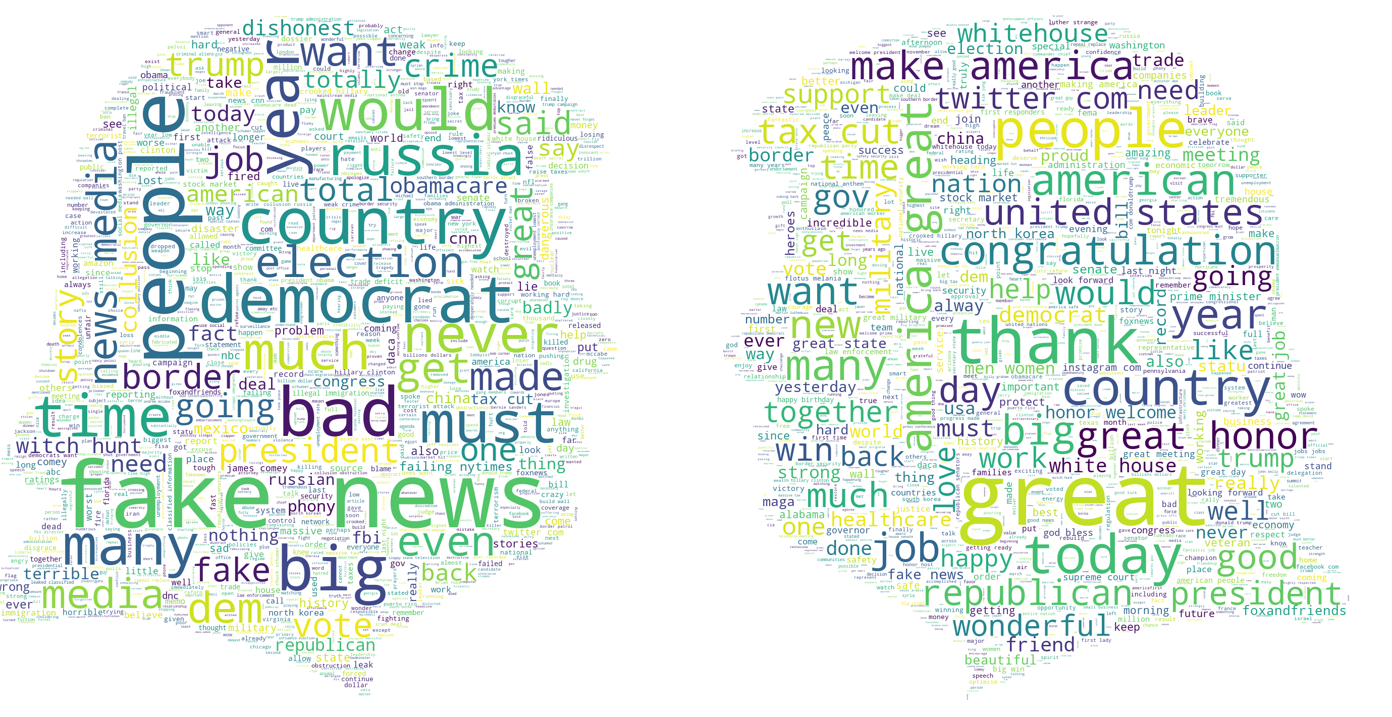 No big suprise that we see terms like fake news, media used frequently in negative and thank, make america , great , tax cut used frequently in positive tweets.