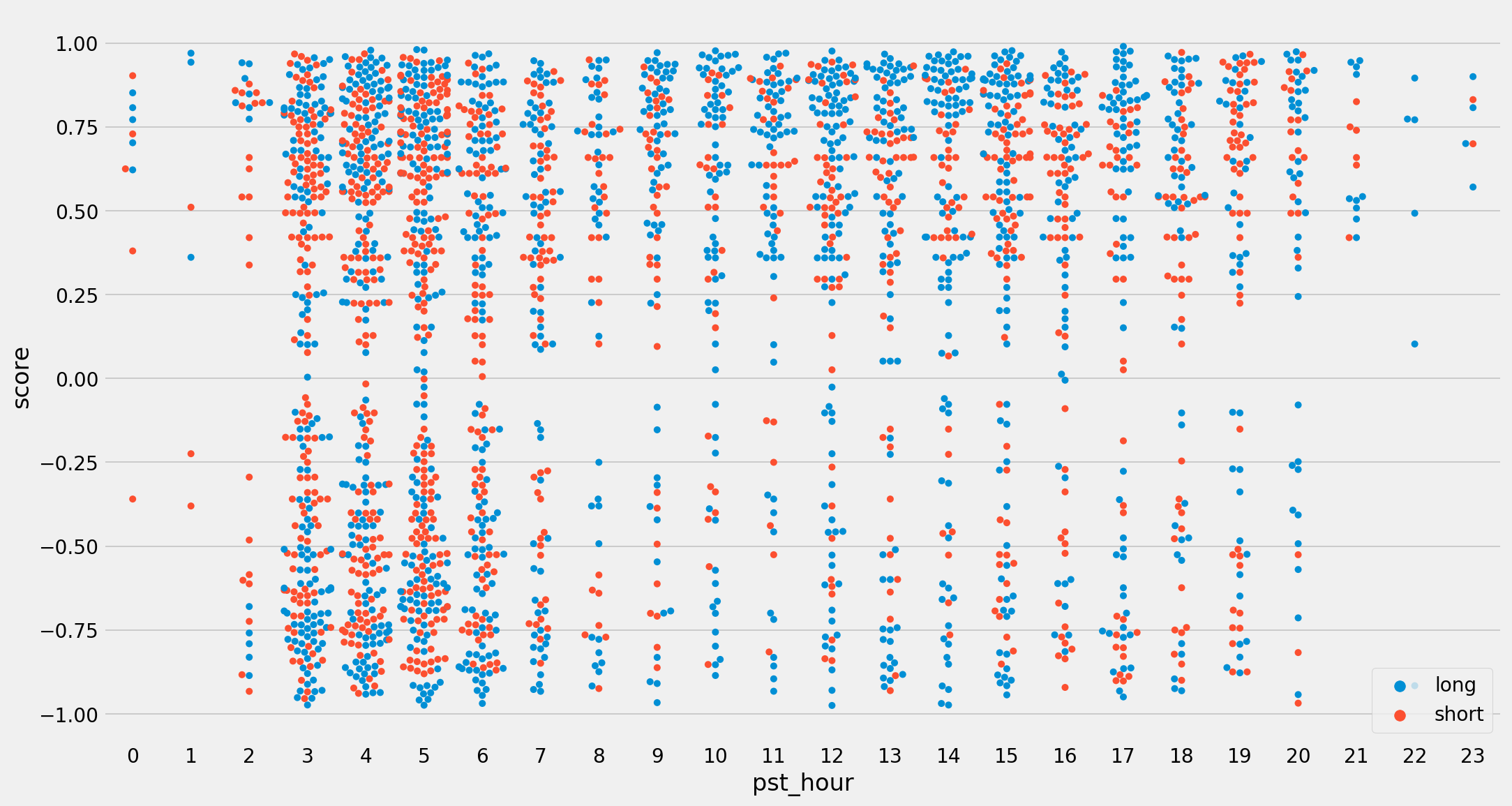 A swamp plot shows that a lots of Tweets (both positive and negative ones) were tweeted before 9am Eastern Standard Time, most tweets from 3pm to 7pm are quite positive.
