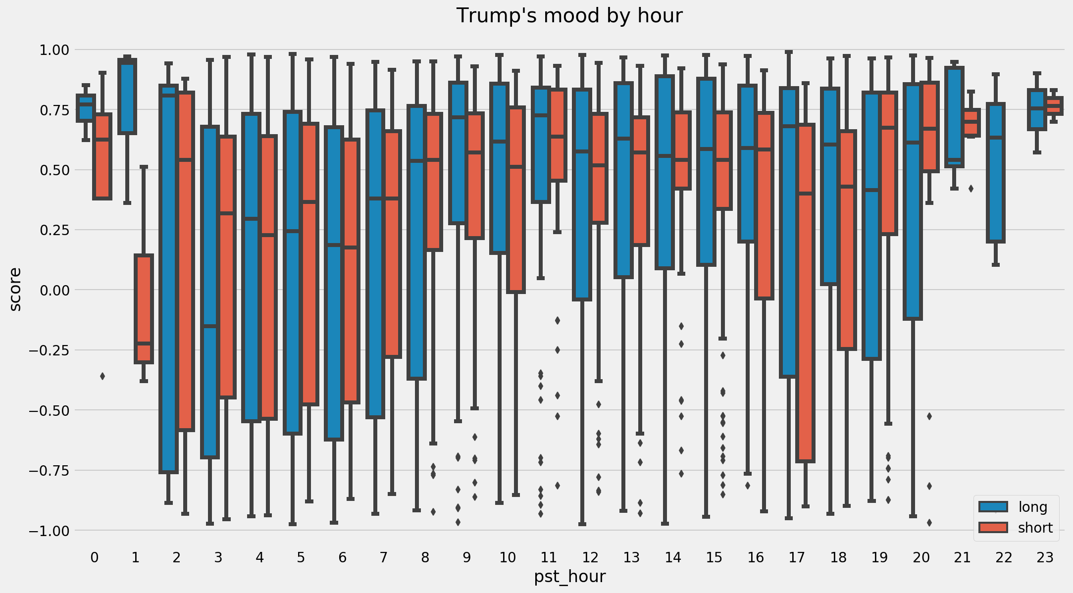 Observing the box plot above, one can reach a conclusion that Trump is positive during Working hours and is a little grumpy before and after work. Maybe expressing negativity on Twitter is a way to fight pressure from running the country!